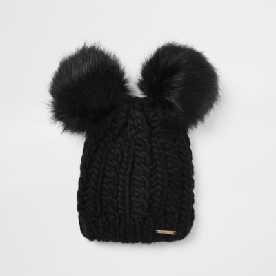 Black cable knit double pom pom beanie